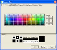 Select the desired colour from the property editor window, it is also possible to change the HSB, RGB, AWT Swing and System Palette. Then click OK to continue.