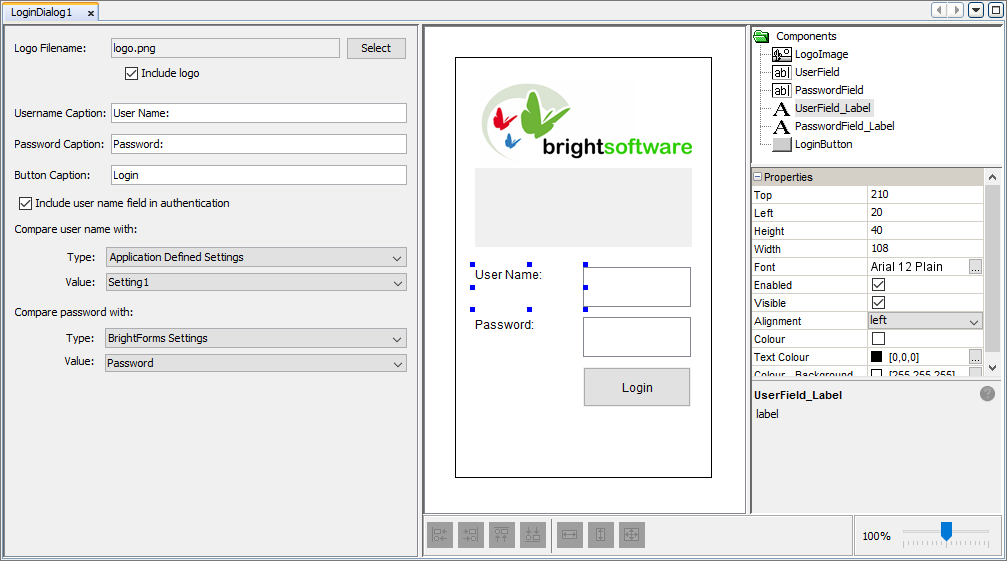 The Login dialog is tasked in providing login capabilities to the application. By entering a user name and a password, these credentials will be checked before allowing further access to the application. There are many options in which the user credentials can be verified. Through the login dialog's editor, what the entered user name and password is compared to, can be defined. These values can be compared to the credentials entered when logging into the BrightForms app or even checked against persisted application defined settings from setting dialogs. Fixed values can also be used to compare the entered password credential.