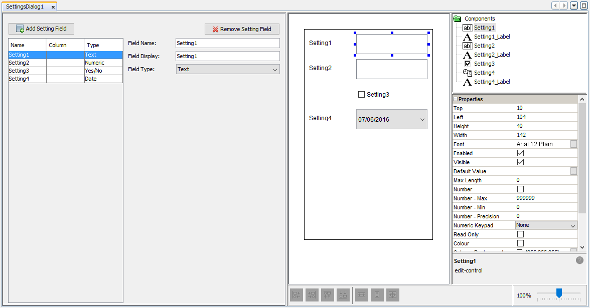 The Settings dialog can be used to create a form that holds fields with the purpose of holding the settings of the application. All settings specified within the dialog can be used as form values within the application. The user can also be given the ability to edit the settings within these dialogs.