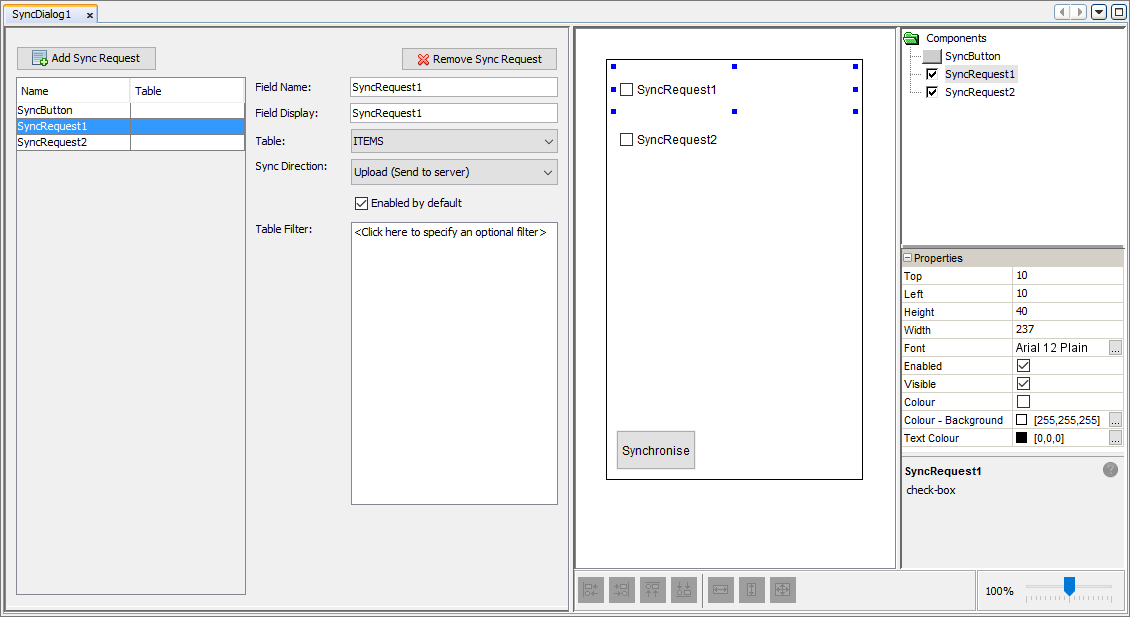 Sync dialogs have the purpose of allowing users of the application to enable and disable synchronisation requests (sync requests) that contains all required information for synchronisation to be completed through the synchronisation engine. Sync requests specify the data to be synchronised and the direction in which this data will be sent (i.e from device to server or vice versa). Sync dialog forms can be used to enable and disable sync requests when synchronisation is needed. The Sync dialog editor allows for multiple sync requests to be added or removed.