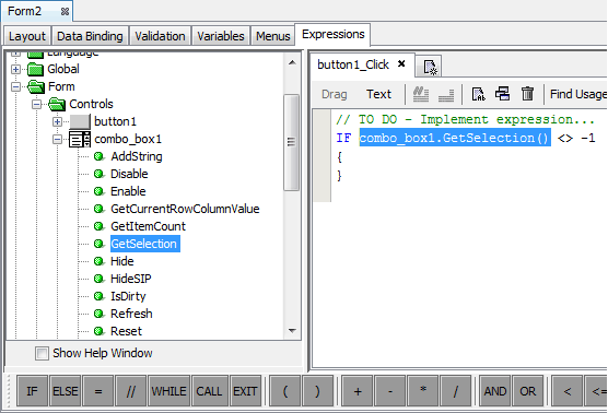 Form controls have methods to manipulate their behaviour. The user can set the focus, disable or enable, show or hide form controls. Listviews, combo boxes, and scribbles also have special methods that allow the user to manipulate the data linked to these controls. Control methods can be found by expanding each control's nodes in the Data Sources tree under Forms > Controls. Only the properties of a control that has placed on the form can be changed.
