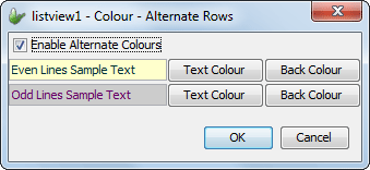Row colouring independent of row data values may be implemented using the 'Alternate Row Colouring' property of the listview control. Here, the setting may be enabled, with the text/background combinations for even and odd rows able to be set. This will take place in the row prior to any other colour settings taking place. The dialog also contains lines of sample text to preview the colours chosen, as shown below. By default, this property is set to False.
