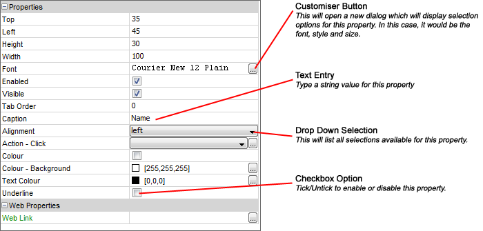 Each control also has property settings that can be changed to alter the way the control looks and behaves. The following image is a label property list, from this property list you can modify any of the label properties by selecting from the drop down list or by entering text. This also illustrates the different types of selection and entry options you have on the property list.