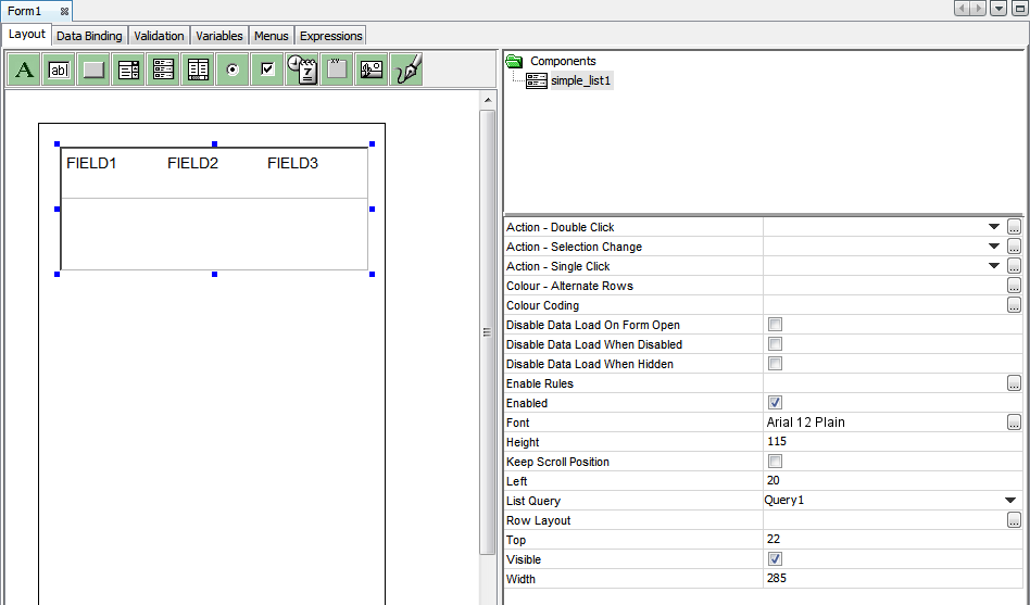 A simple list is fundamentally a listview control with a single column of which layout can be defined by the designer. The behaviour and functionality of the properties listed in the below table are explained in the Listview control section above.