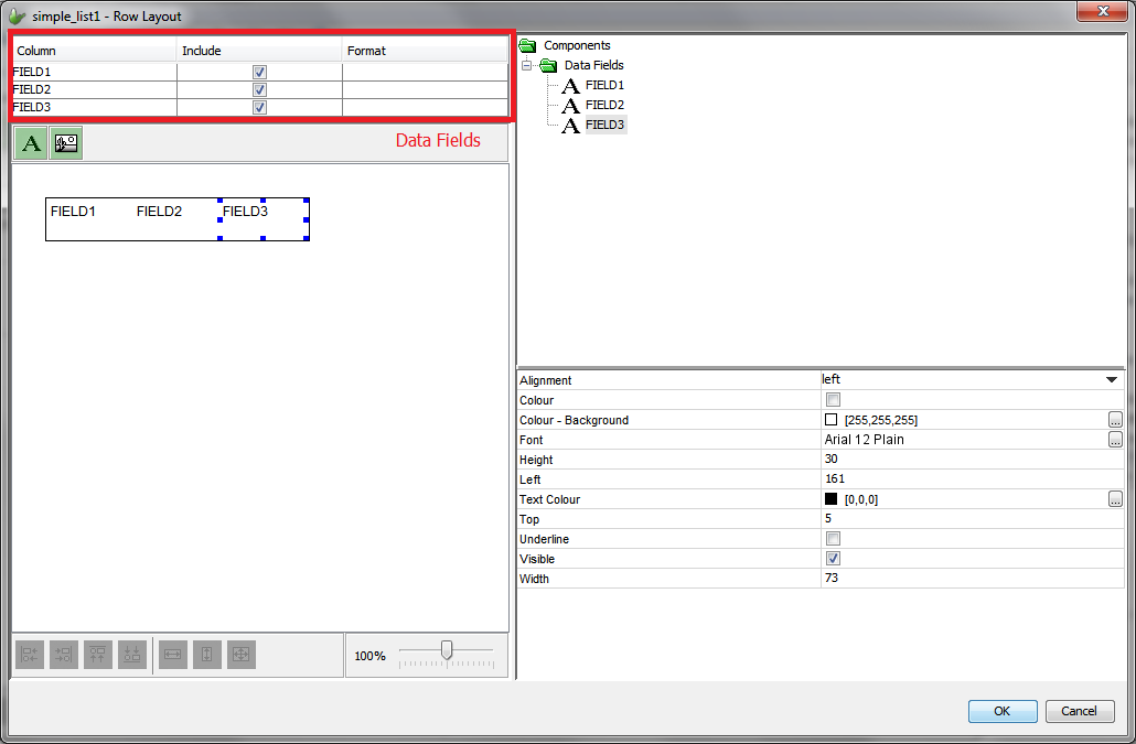 By ticking on or off the Include check box element for each data field, a query output field can be included or excluded in the row layout. As each data field is included or excluded from the layout, they will appear or disappear from the row layout.