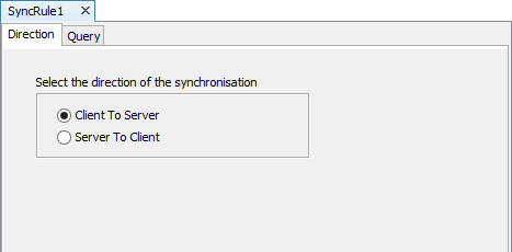 The Direction tab has two choices depending on which direction the data needs to be transmitted. Data can be synchronised from the client to the server or from the server to the client.