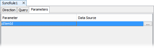 Sync Rules can use non-parameterised or parameterised queries. When a parameterised query is used a third tab will appear in the SyncRule Source Editor window, the Parameters tab. In this tab, the parameter values must be specified for synchronisation. To do this,