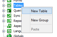 In the project tree, right click on the Tables subtree. And press ‘New Table’ in the popup menu. This will create and open a table.
