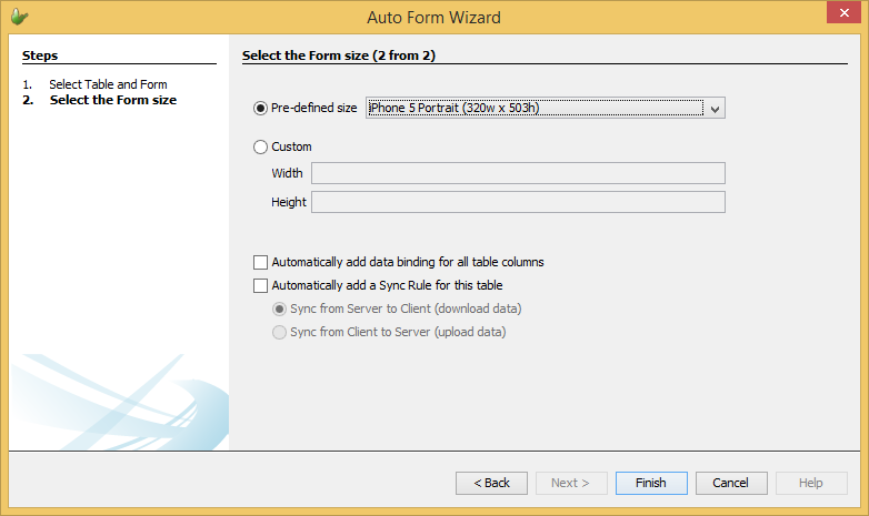 We’ll set the size of the form either using Pre-defined sizes or entering our own custom size. This dialog also optionally allows users to add data binding for each table columns and/or automatically add a sync rule for the table. Sync Rules will be explained further later in this tutorial. For now, leave both these options unchecked. Set the size to ‘iPhone 5 Portrait’ and press ‘Finish’.