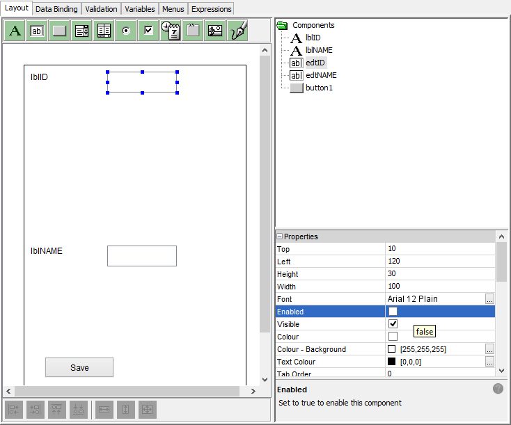 Click the edit control for the ID column in the table. Untick the Enabled property. We are doing this to stop users from entering values into this control as we will use a random number generator to specify the primary key.