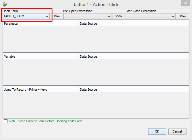 In this dialog, using the combo box under ‘Open Form’ select the form we created from the table definition in tutorial 5.2 and press ‘OK’. When clicked the button will open the form.