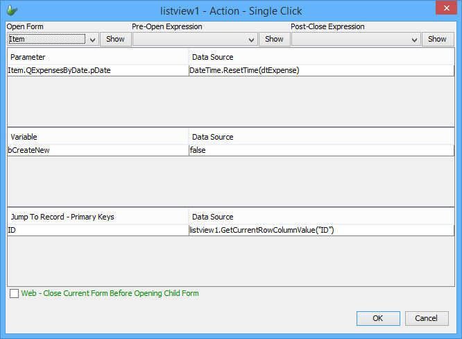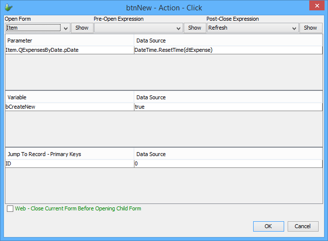 Assign Refresh expression to Action-Open property of Form and Action - DateTime Change of dtExpense