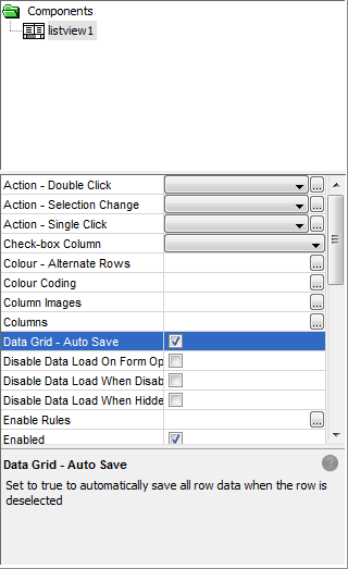 Having the ‘checkbox’ property for the data cell will allow the user to modify the columns where necessary. The ‘Data Grid –Auto Save’ property being set to true will also save this change locally as soon as it is made. If this property is not utilised, data grid records may be manually saved via the listview.Save() method in expressions.