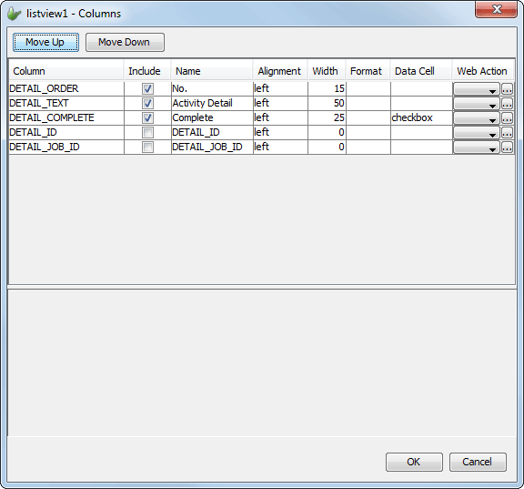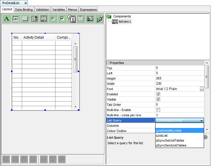 As with previous listviews, the ‘List Query’ defines what records are displayed in the listview at run time. Create a new query – ‘qJobDetailByJobId’, which will return a set of detail records based on a JOB_ID and assign it to this listview.
