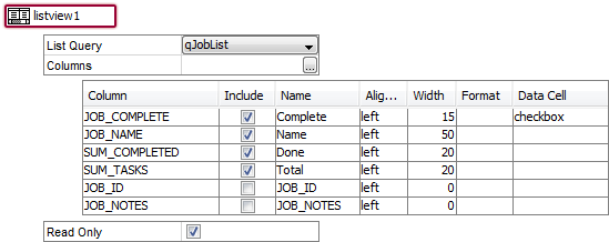 Set the listview’s Query Property as ‘qJobHeaders’, and define the columns as follows: