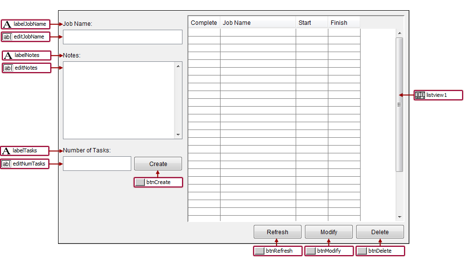 Use the diagram below to position and configure the controls of the form, particularly the listview, with a few properties such as Query and Columns, which need to be tweaked.