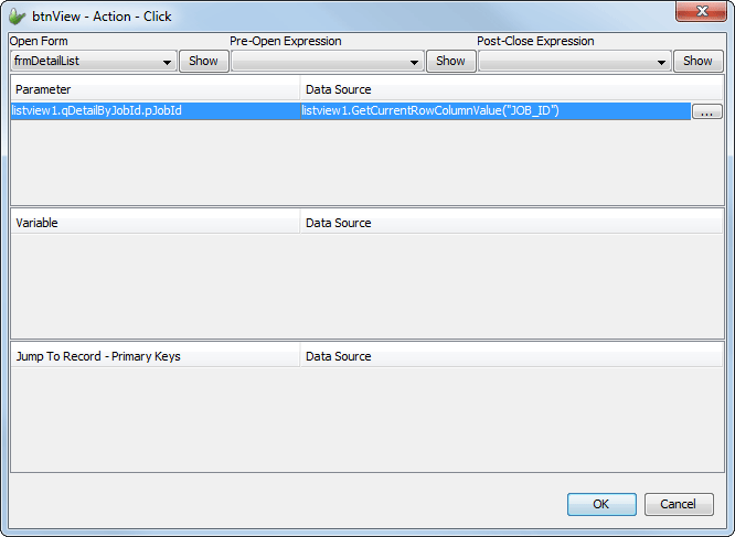 This will open the Form Open dialog, which allows the opening of forms with Parameters set on initialisation. Configure this dialog to have the button open the ‘frmDetailList’ form.