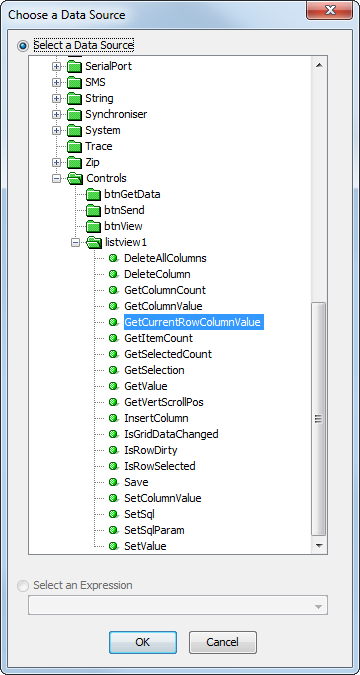 Sync rules are enabled and/or executed via Expressions utilising Synchroniser object methods. To have the frmGetData button perform a synchronisation, double clicking the button, and select to create a new expression. The expression ‘btnGetData_Click’ will be created, and link to the ‘Action – Click’ property. Define the expression as follows: