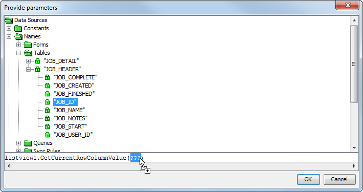parameter as listview.GetCurrentRowColumnValue(“JOB_ID”)’ by tapping