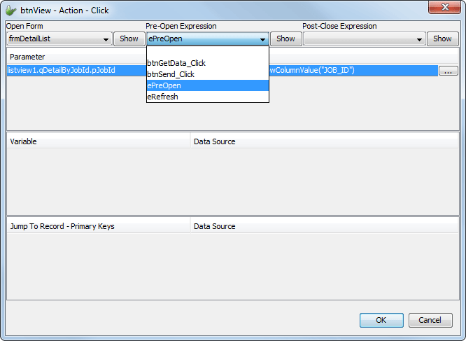 Continue to link this new expression to the ‘Pre-Open Expression’ field to the form open dialog created in the previous step. This will have the expression run immediately when the ‘btnView’ control is tapped.