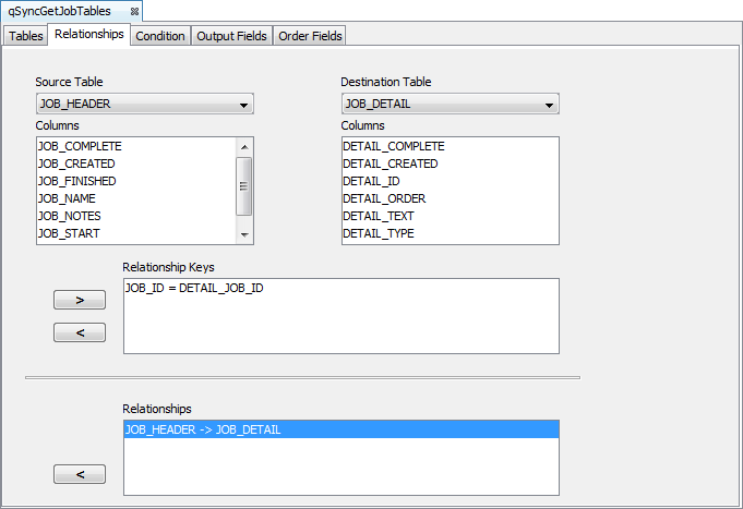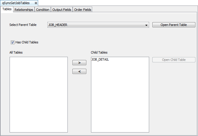 Create a new Query called ‘qSyncGetJobTables’. This will be used to retrieve all JOB_HEADER records on the server, and any matching JOB_DETAIL records when used with a sync rule. This may be defined via a standard query as follows: