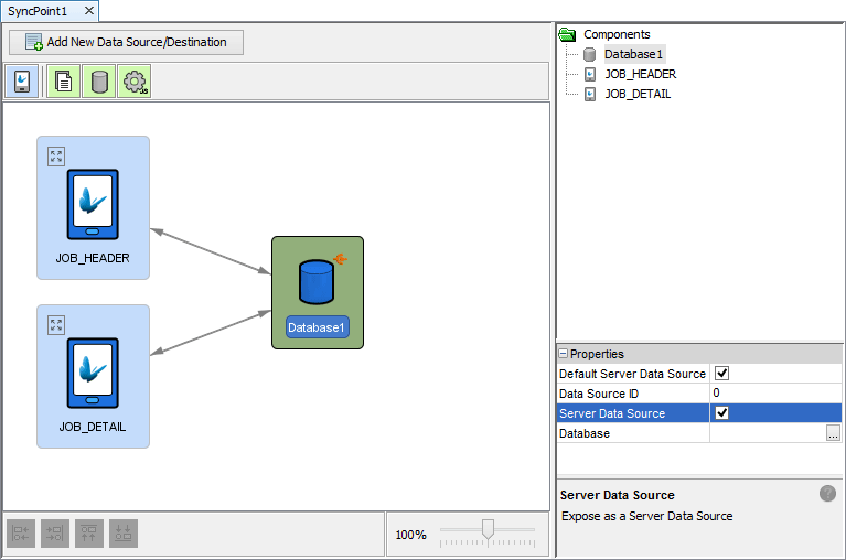 Drag and drop an edge of the table sources to the edge of the database. This will create a line connecting the two together, allowing Client -> Server synchronisation to occur for the table. Proceed to connect both tables to the database data source in both directions.