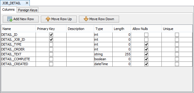 Data record definitions are defined in BrightBuilder through Tables. These tables form the basis of data operations within the project. Create the following two tables in the project, by right clicking the Tables node and selecting New Table. From here, define the following tables - JOB_HEADER and JOB_DETAIL, with the following definitions: