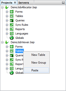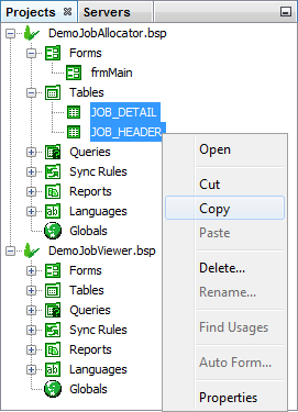 The reader is designed to read the same data types as DemoJobAllocator.bsp. Therefore, copy the JOB_HEADER and JOB_DETAIL tables from the project DemoJobAllocator.bsp by selecting both elements in the project tree, then selecting ‘Copy’ from their context menu.
