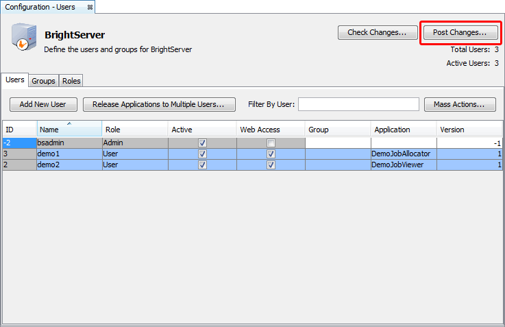 Once deployed, the application may then be released to users, which is done via the Configuration - Users panel.