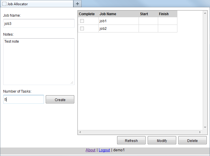 After logging in with the user credentials for the DemoJobAllocator application, it will load via BrightWeb in browser. Proceed to populate the jobs table with tasks; checking the SQL server such as with SQL Server Management Studio, these changes may be observed in real time.