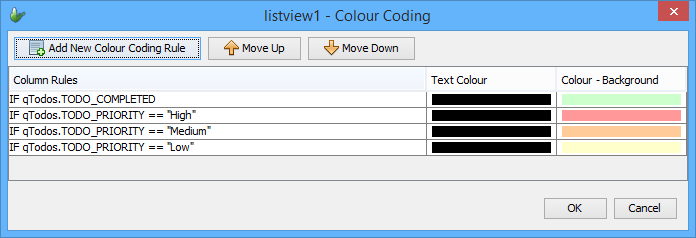Set the Colour Coding of the listview to via the properties panel. Based on the column rules, the text and background of rows will be highlighted as defined, with the top-most rules having priority.