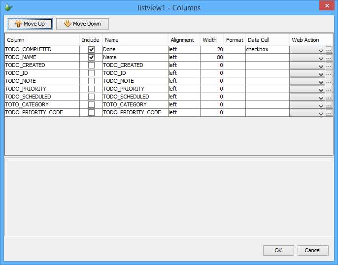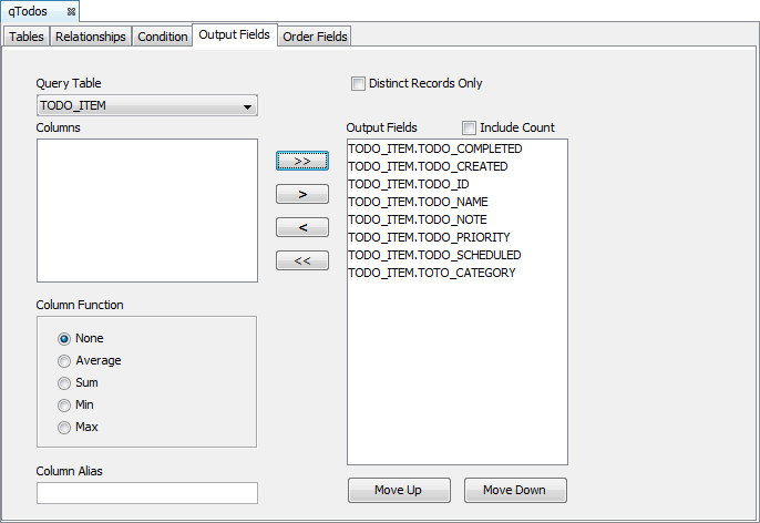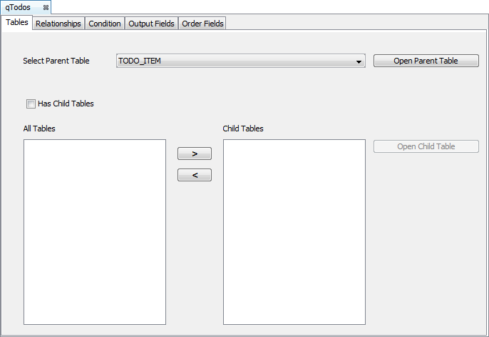 The main form has a listview which displays records on the device. To specify what records are to be displayed from the device’s database, a query is used by the application, and therefore needs to be defined. Create a standard query on the TODO_ITEM table with no joins or conditions. As there are no conditions, the query will return all the records in the table when used. All fields may then be specified as the output.