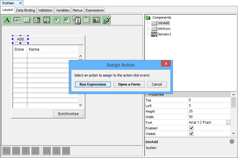 Finally, implement the Sync Rule by specifying an expression when the ‘Synchronise’ button is tapped. With the previously created query ‘qToDo’, create a sync rule – ‘qGetToDo’ with the direction of synchronisation from the server to the client.