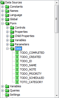 In assigning this query under the Data Binding tab, output fields of the query may be accessed via the Form > Data node of the Data Source tree. The data sources under this node may be referenced and/or assigned through the lifetime of the form, and saved when the Form.SaveRecord() method is called.