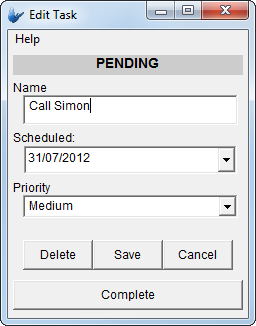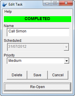 To do items may be added, modified and deleted within the application via the edit screen, where the title, priority and scheduled date may be changed. The edit screen also allows users to complete open tasks, and re-open complete tasks, which results in a viewable UI change for the user. The state of the record is saved when the ‘Save’ button is tapped.