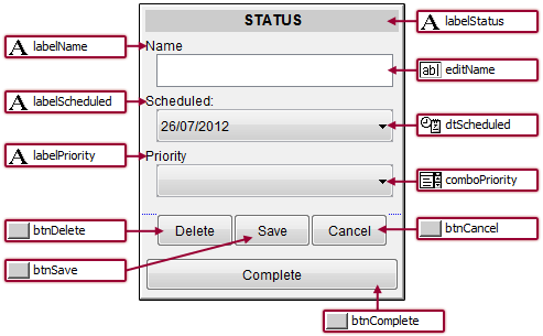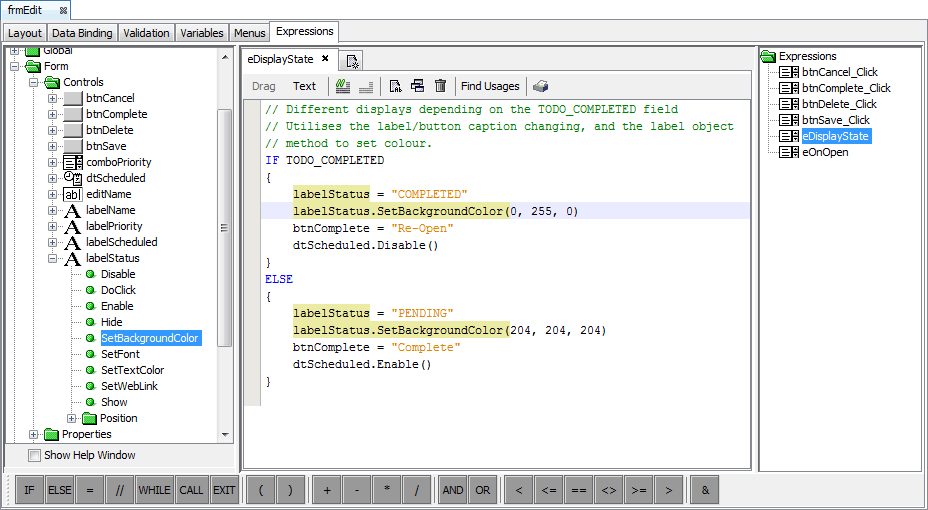 The following code for ‘eDisplayState’ will change the controls on the form, depending on the state of the record’s data. If the record is marked as ‘completed’, the status label’s background will change to green, and the ‘Complete’ button will change to ‘Re-Open’. The ‘Scheduled’ control will also be disabled, to prevent user changes.