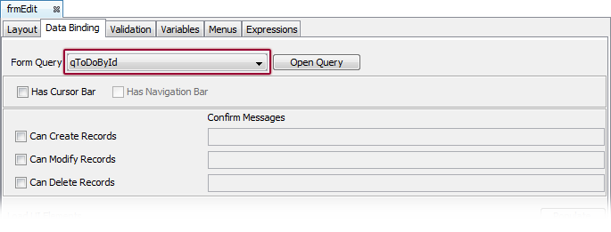 Once this is created, link the query to the form by locating the ‘Data Binding’ tab of frmEdit. Assign the new query as shown below.
