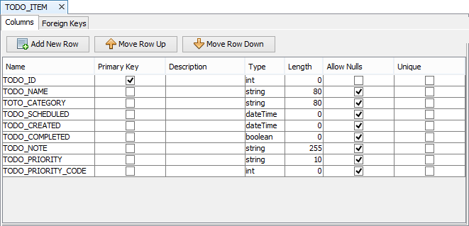 Once created, firstly create the data tables which the application will operate on. To do this, expand the new project’s node and right click on ‘Tables’. Create a new table named TODO_ITEM, and define it as follows: