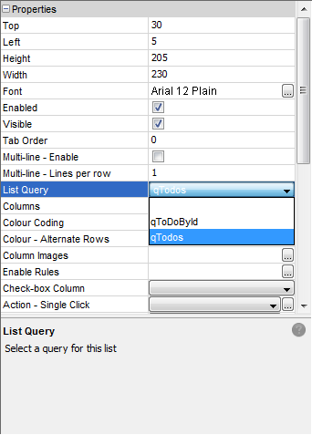 The listview control allows a form to display the set of records returned by a database query. Set the listview query to display all the records in the TODO_ITEM table, by assigning the query ‘qToDo’ to the ‘List Query’ property.