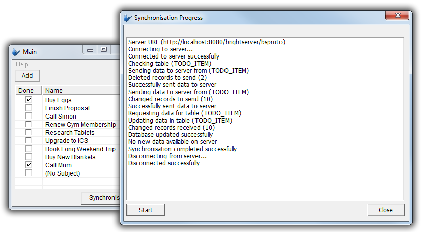 After BrightForms’ users and settings are configured, test the application by creating a new ToDo item with the ‘Add’ button, then tapping the ‘Synchronise’ button. The records will be sent to the server, with any server records sent to the device. Observe these records sent to the server tables, and create records on the server which will be retrieved by the device on synchronisation.