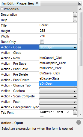 Use the accessible data from the query to populate the form’s controls on open. To do this, create the expression, eOnOpen, to query the local database and then display the result as the form’s edit controls. Once created, set the expression to the form’s ‘Action – Open’ property. As displayed below, an additional expression ‘eDisplayState’ must be defined. Create this expression to fill in the next step.
