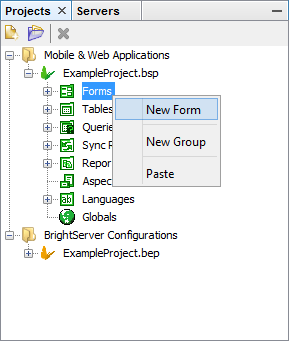 Select the New Form option. A new form will be created and opened for editing, named 'Form1'. This element may be found in the Project tree by expanding the Forms node.