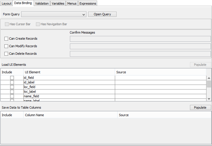 When a form query is selected, the data binding tab will change, by enabling the option to use cursor forms, and by populating the ‘Save Data to Table Columns’ table with the query’s output fields.
