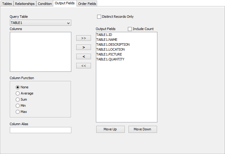 Use the Data Binding tab to start using data binding in a form. Similar to the listview, the set of records to be utilised needs to be specified by a query to the database. The set of records retrieved will match the Conditions of the query, and the data columns will match Output Fields of the query. Set this query using the drop down menu ‘Form Query’, which lists all queries defined in the project.