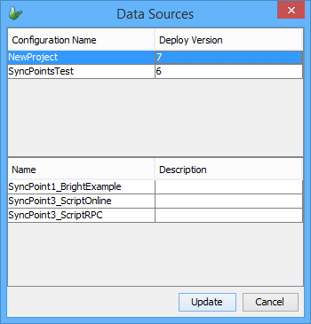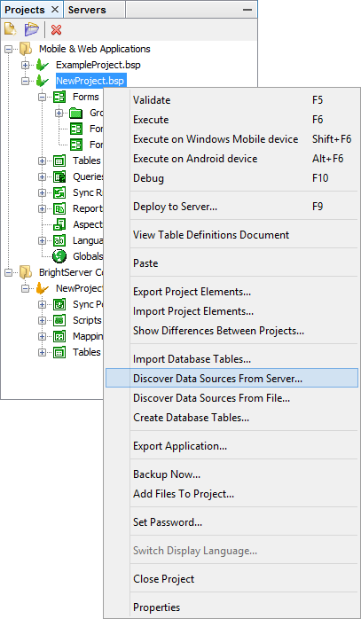 Right clicking a project will display the option to discover data sources either from the server or files. Selecting 'server' will connect to a server, and retrieve a list of exposed data sources from the server's configuration, displaying the results in a dialog. The 'files' option will do this from opened BEP projects. Upon tapping the 'update' button, the BSP will register the sources into the project. Once registered, these data sources may be assigned to queries via drop down menu.