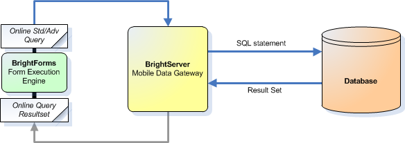 Consider the diagram below. Both standard and advanced queries create an online query which is read by BrightServer. This query is then passed and executed on the server, returning a record set, which is then passed to the device as is (ie. flat). This record set may then be displayed in components such as listviews and combo boxes in a static, read-only fashion.