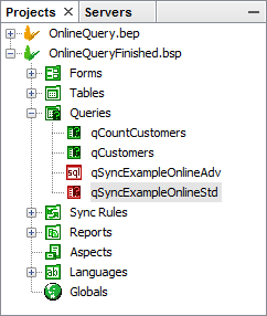 Databases may thus be defined as regular sync points, but also be enabled for stored procedures and other types of online queries at the same time. Demonstrated below are two queries, 'SyncSendCustomers', a standard query sync process, and 'SyncExampleOnlineStd', an online synchronisation. As they both operate on the same database, they may be contained in one sync point, but in fact, many different types of syncs may be performed with online querying.