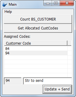 Selected codes in the table may be used to send data to the server with the 'Update + Send' button. This will deallocate the user assignment, and populate the CUST_NAME field for the record to the value specified by the edit control. The customer code listview is also refreshed after this, reflecting the current server state.