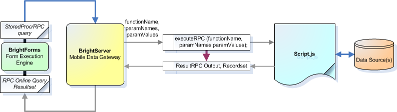Setting up an RPC is in the form of a script and located and executed on BrightServer rather than the database. This script accepts input parameters via the executeRPC() function, and may may interface with a range of sources, including a database itself. The script's function will then return parameters and outputs to BrightServer, which will then send the online query resultset to BrightForms. All of this occurs over BrightServer's sync engine.