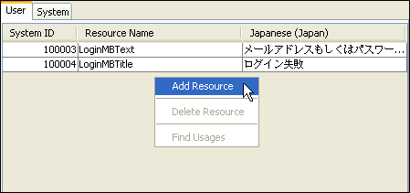 To create a new User Resource Right Click in the table and select Add Resource via the context menu. This context menu may also be used when deleting user resources.